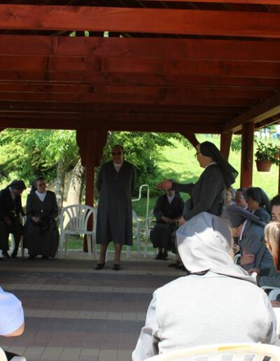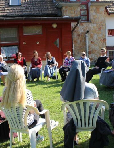 Délután a Generális anya először a szalézi atyákkal és nővérekkel beszélgetett, nyitott szívvel fogadta a számtalan kérdést, válaszaival az Isten felé vezetett bennünket. Külön kis találkozója volt a szalézi munkatársakkal , végül a fiatalokkal, akik a zöld fűben ülve figyelmesen hallgatták Yvonne anya szavait. Közben a gyerekek játszottak, banszoltak, fociztak… öröm és boldogság, igazi szalézi hangulat volt!