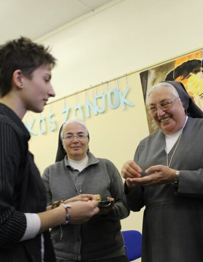 A lányok és a közösség, ünnepi zenével és virágcsokorral várta a Generális anyát. A színes műsor után a kollégisták bátran kérdezték a vendéget. A hálaadó szentmisét családias agapé követte. Késő délutánig tartott az ünnep.