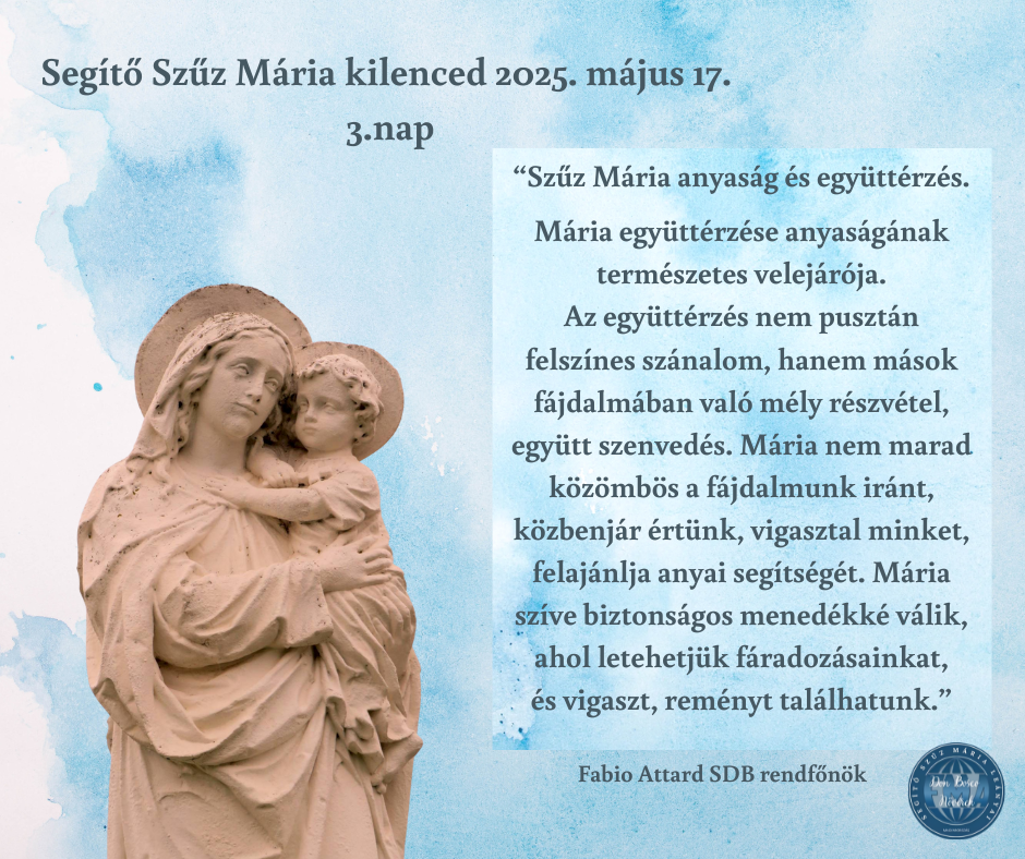 A hagyományoknak megfelelően idén is kilenceddel készülünk 2025. május 24-re, Segítő Szűz Mária ünnepére. A készületben az egész szalézi világ egyesül május 15-e és 23-a között a kilenced imádságban. „Legyetek gyermekek” – ez az idei imádság témája. Fabio Attard SDB rendfőnök üzenetét tolmácsoljuk az ünnep kapcsán nap mint nap.