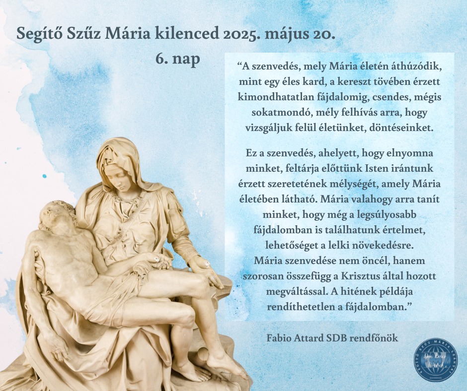 A hagyományoknak megfelelően idén is kilenceddel készülünk 2025. május 24-re, Segítő Szűz Mária ünnepére. A készületben az egész szalézi világ egyesül május 15-e és 23-a között a kilenced imádságban. „Legyetek gyermekek” – ez az idei imádság témája. Fabio Attard SDB rendfőnök üzenetét tolmácsoljuk az ünnep kapcsán nap mint nap.