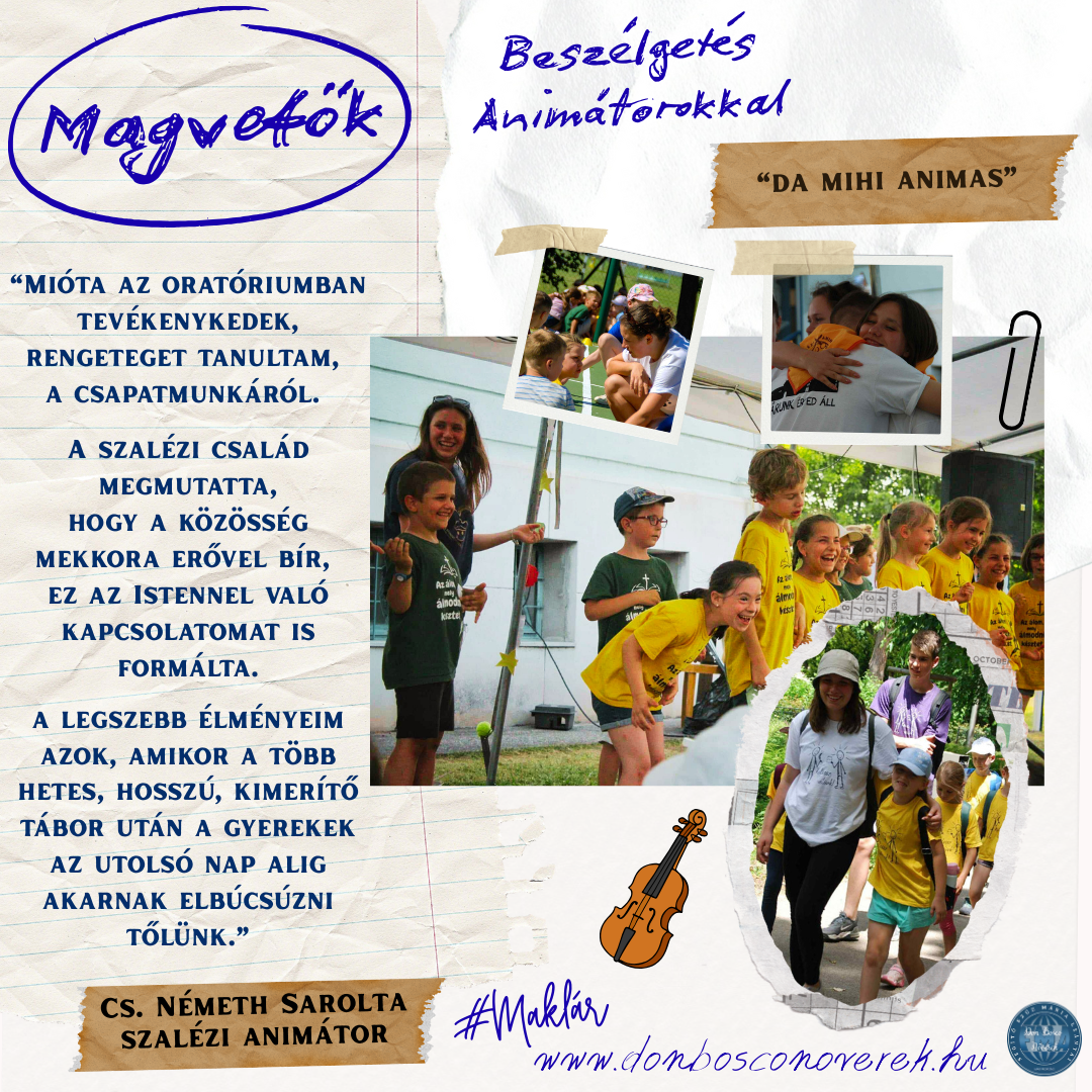 Cs. Németh Sarolta vagyok, maklári és egri animátor, 2021 nyarán csatlakoztam a szalézi családhoz. Nyolcadikosként vettem részt először az egri nyári táborban és a szalézi lelkiség annyira magával ragadott, hogy már ugyanezen év szeptemberében elkezdtem az animátorképzést is. Szerencsésnek érzem magam, hisz a saját falumban, Makláron pont ekkor indult el az oratórium, így részese lehettem egy új közösség születésének is. Az első alkalmak nagyon izgalmasak voltak Makláron, hiszen az oratóriumi munkát a nővérekkel karöltve másik kettő olyan társammal kezdtük meg, akikkel még első éves képzésben lévő kisanimátorok voltunk. Ez eleinte sok nehézséget okozott, de közös erővel túllendültünk ezeken és egy csodás új közösséget alakítottunk ki.
