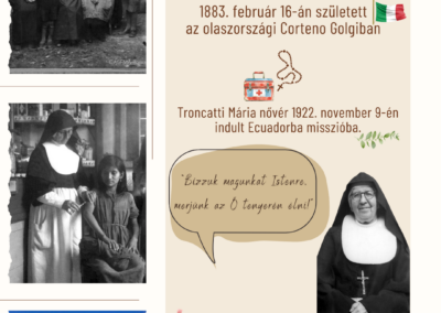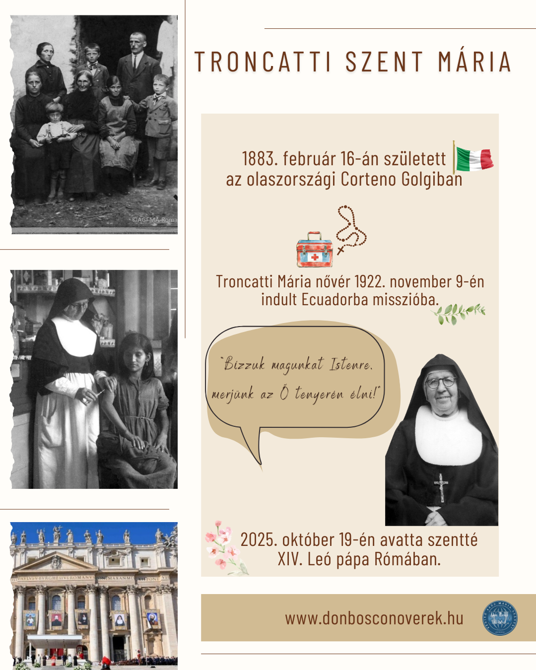 Az anyai dimenzió az a vonás, amely világosan megjelenik Troncatti Mária nővérben, egy olyan dimenzió, amely az élet bőségét generálja körülötte, és forrását az Úrral való mély bensőséges kapcsolat adja.