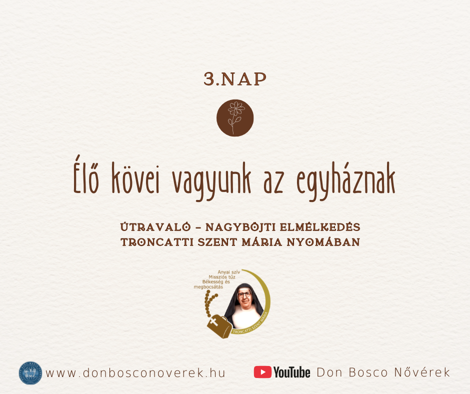 Mi lenne az egyházzal a Szűzanya, Szent József, az apostolok vagy például Avilai Nagy Szent Teréz, Bosco Szent János, Mazzarello Szent Mária Dominika vagy akár Troncatti Szent Mária nélkül. Mindenki pótolható? A szentek élete megmutatja, hogy mindannyian élő kövei vagyunk az egyháznak. Az Isten álmodik nekünk, velünk, értünk valamit. Mária nővér élete és a mi élettörténetünk nem csupán egy egyszerű életrajz, hanem az üdvtörténet fontos része. Mária nővér nem kivételes, eredményes akart lenni, hanem engedte, hogy a Szentlélek segítse, meglátogassa és gyümölcsöt teremjen benne és általa.