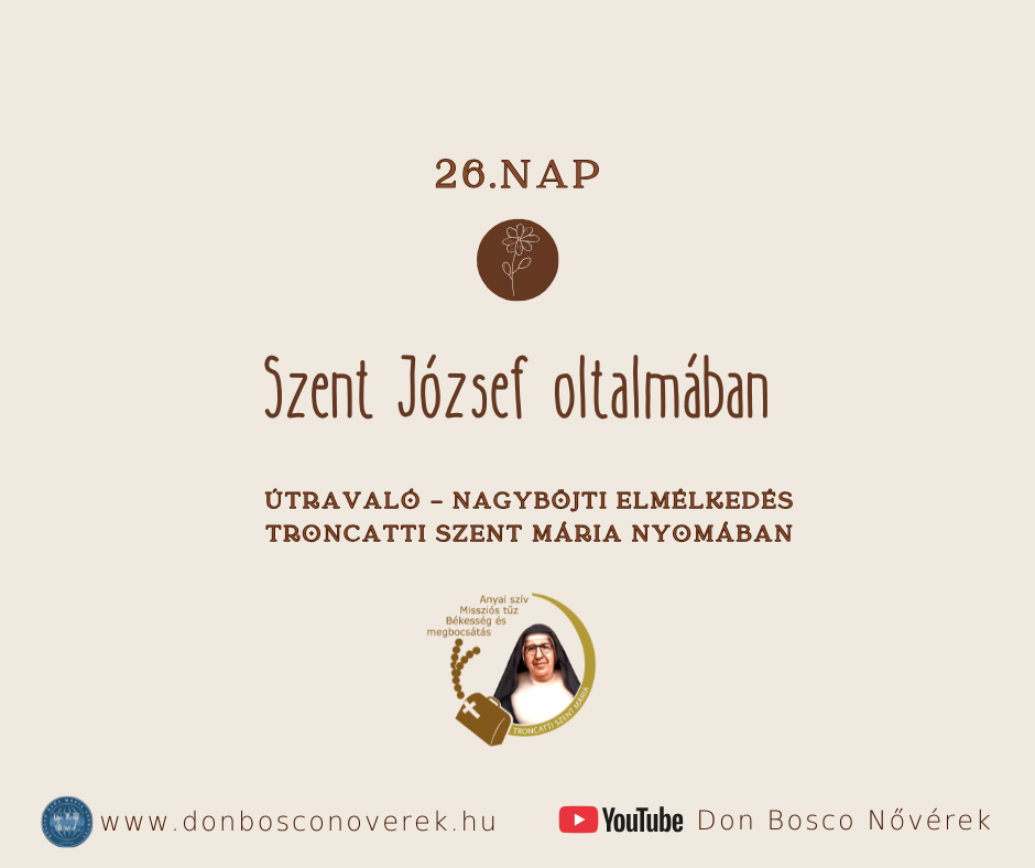 Ma szent Józsefet, Szűz Mária jegyesét ünnepli az Egyház. Troncatti Mária különösen is tisztelte Őt, mint szerzetesrendjének pártfogóját; benne példát és hathatós közbenjárót talált. A nővérek Szent Józsefet “házuk, otthonuk Oltalmazójaként” hívták segítségül.Nem elsősorban a falakból álló házra kell gondolnunk. Jézus első otthona valójában “Mária” volt. József azzal, hogy gondját viselte Szűzanyának, vállalta azt is, hogy őrzi Jézus jelenlétét, aki az ő méhében növekedett. Szent Józsefen keresztül mindenekelőtt Istenre bízhatjuk azt a házat, amely a szívünk. Őrá bízhatjuk “a testünk házát” is, amely arra lett teremtve, hogy “Isten temploma legyen”. Szent Józsefre bízhatjuk “a szerzetesi illetve a családi házat” is, hogy aki oda belép, megtapasztalhassa: Isten szereti őt. Végül Szent Józsefre bízhatjuk “az Egyház házát” is. Az Egyház az a ház, ahol Isten gyermekei összegyűlnek.