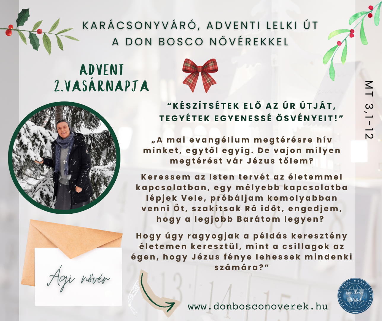 Advent 2. vasárnapján Ági nővér hív elmélkedésre minket