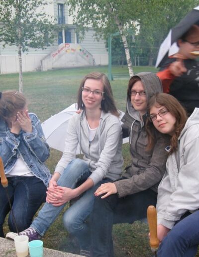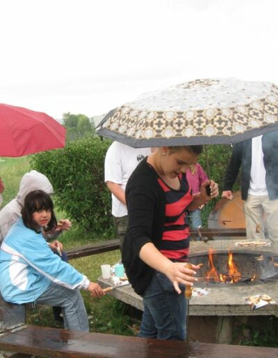 Bár kezdetben szemerkélt az eső, minket az sem akadályozott meg a nyársalásban, úgyhogy az ima után elkezdtünk készülődni a nyársaláshoz. Picit esett, de nem volt felhőszakadás, a tüzet nem oltotta el a víz ( jó, talán egyszer ), nagyon vicces volt esernyő alatt vacsorázni.